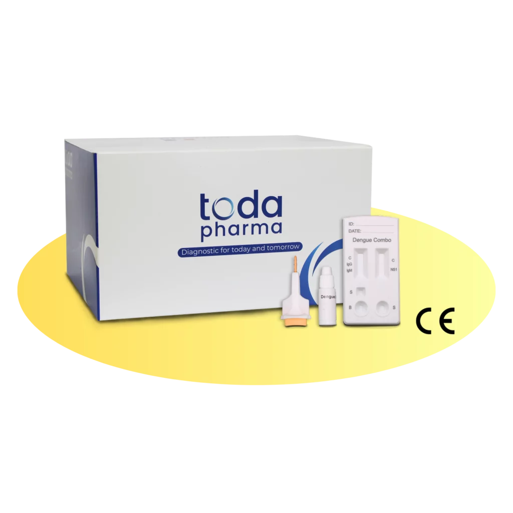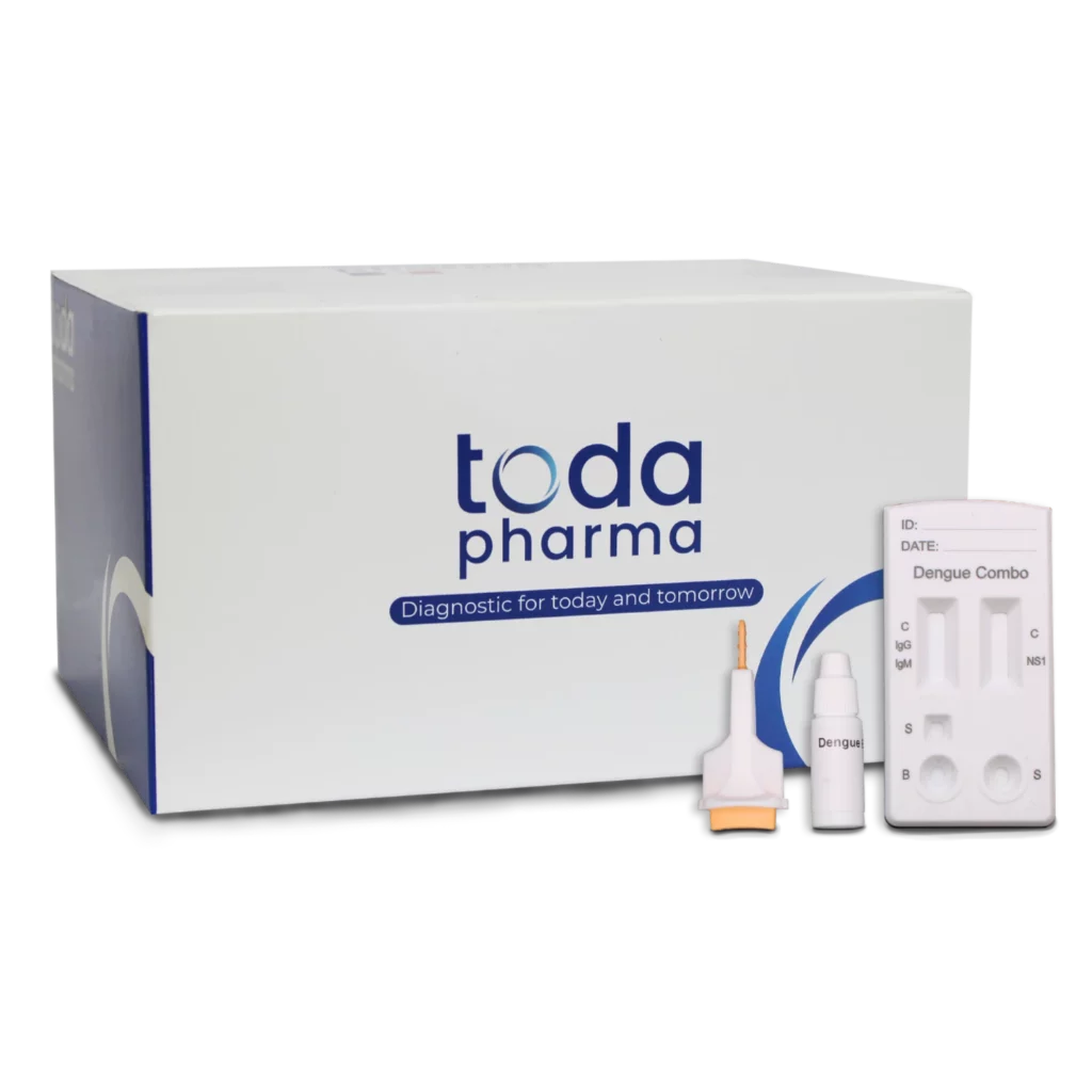 Toda Dengdiag ® Combo est un test de diagnostic rapide pour la détection qualitative simultanée de l’antigène NS1, des immunoglobulines G et des immunoglobulines M sur un échantillon de sang (sang total, sérum ou plasma).