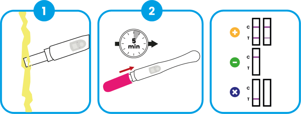 Le test contient des anticorps sensibles à l’hCG. Lorsqu’ils entrent en contact avec l’urine contenant l’hormone, une réaction se produit et fait apparaître un trait (ou un symbole) dans la fenêtre de résultat.
