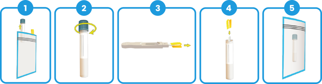 Avec Toda Xper® Diag, le pad de prélèvement utilisé lors du test salivaire est retiré à l’aide d’une pince, puis placé dans un tube de transport dédié. Cette méthode évite d’avoir à refaire un prélèvement, tout en limitant les risques de falsification, notamment dans les cas où certains individus tentent de fausser le second test en ingérant des substances après le dépistage initial.